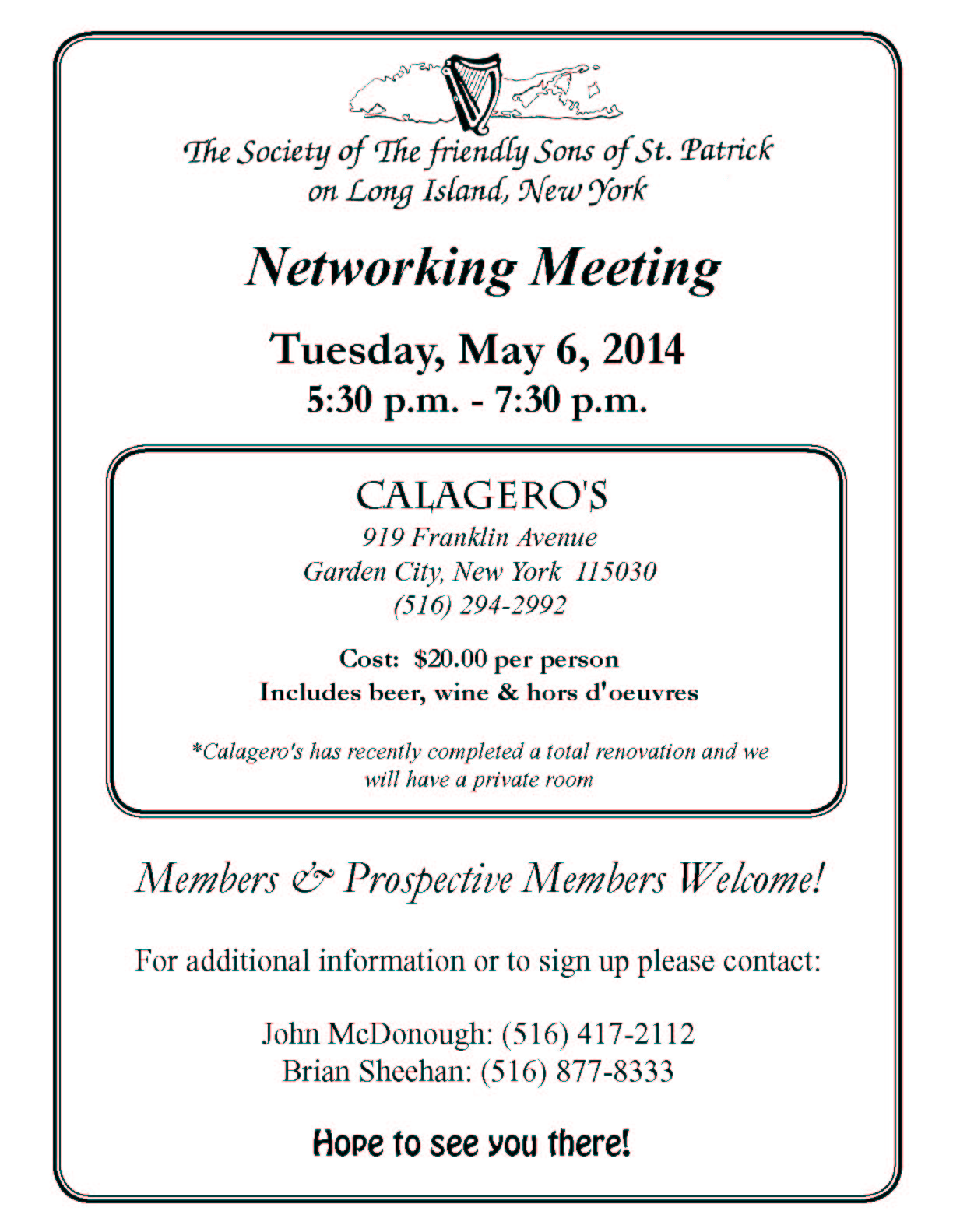 Calagero's 919 Franklin Avenue, Garden Ciry, NY, United StatesCost: $20.00 per person Includes beer, wine & hors d'oeuvres For additional information or to sign up please contact: John McDonough: (516) 417-2112 Brian Sheehan: (516) 877-8333