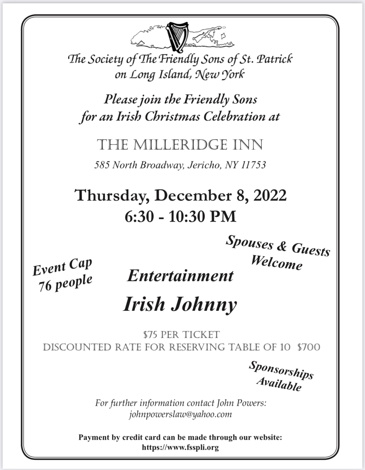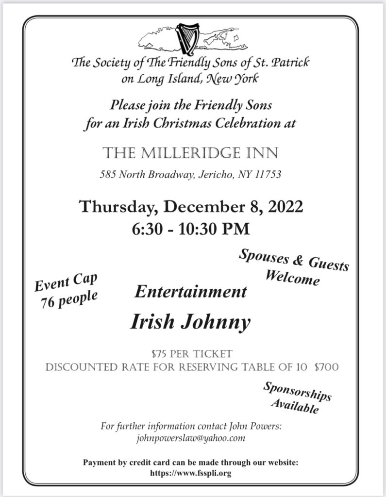 « All Events This event has passed. Christmas Party December 8, 2022 @ 6:30 pm - 10:30 pm « Golf Outing 37th Annual Emerald Ball » Christmas Party Name* First Last Address* Street Address Address Line 2 City State / Province / Region ZIP / Postal Code Email* PhoneProduct Name*Single TicketTable of 10Number of Tickets or Tables*Total $0.00 Credit Card American ExpressDiscoverMasterCardVisaSupported Credit Cards: American Express, Discover, MasterCard, Visa Card Number Month010203040506070809101112 Year20262027202820292030203120322033203420352036203720382039204020412042204320442045 Expiration Date Security Code Cardholder Name CAPTCHAPlease Press Submit Only Once Δ Add to calendar Google Calendar iCalendar Outlook 365 Outlook Live Details Date: December 8, 2022 Time: 6:30 pm - 10:30 pm Event Category: Holiday Venue Mileridge Cottage 585 Norith Broadway Jericho, NY 11753 United States + Google Map Phone (516) 931-2201