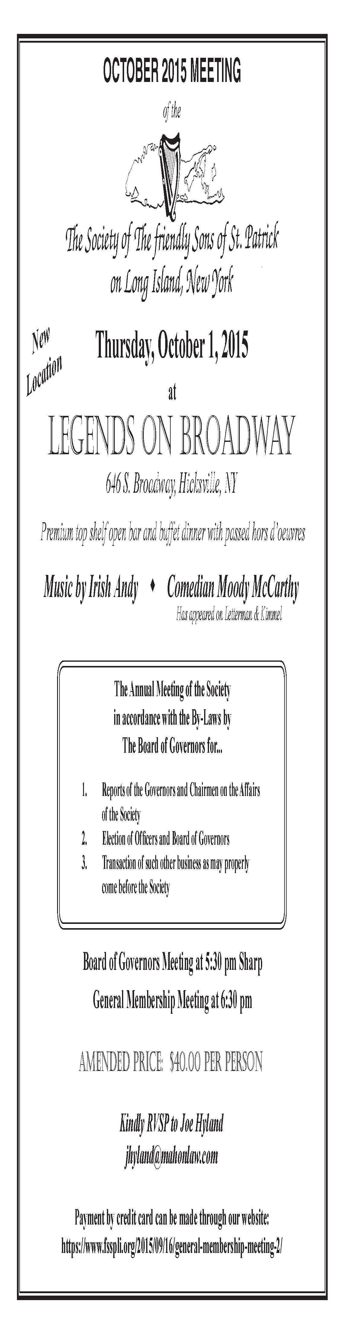 « All Events This event has passed. General Membership Meeting October 1, 2015 @ 5:30 pm - 10:00 pm « FSSP Golf Outing – Monday September 14, 2015 Christmas Party » Annual Meeting Name First Last Address Street Address Address Line 2 City State / Province / Region ZIP / Postal Code AfghanistanAlbaniaAlgeriaAmerican SamoaAndorraAngolaAnguillaAntarcticaAntigua and BarbudaArgentinaArmeniaArubaAustraliaAustriaAzerbaijanBahamasBahrainBangladeshBarbadosBelarusBelgiumBelizeBeninBermudaBhutanBoliviaBonaire, Sint Eustatius and SabaBosnia and HerzegovinaBotswanaBouvet IslandBrazilBritish Indian Ocean TerritoryBrunei DarussalamBulgariaBurkina FasoBurundiCabo VerdeCambodiaCameroonCanadaCayman IslandsCentral African RepublicChadChileChinaChristmas IslandCocos IslandsColombiaComorosCongoCongo, Democratic Republic of theCook IslandsCosta RicaCroatiaCubaCuraçaoCyprusCzechiaCôte d'IvoireDenmarkDjiboutiDominicaDominican RepublicEcuadorEgyptEl SalvadorEquatorial GuineaEritreaEstoniaEswatiniEthiopiaFalkland IslandsFaroe IslandsFijiFinlandFranceFrench GuianaFrench PolynesiaFrench Southern TerritoriesGabonGambiaGeorgiaGermanyGhanaGibraltarGreeceGreenlandGrenadaGuadeloupeGuamGuatemalaGuernseyGuineaGuinea-BissauGuyanaHaitiHeard Island and McDonald IslandsHoly SeeHondurasHong KongHungaryIcelandIndiaIndonesiaIranIraqIrelandIsle of ManIsraelItalyJamaicaJapanJerseyJordanKazakhstanKenyaKiribatiKorea, Democratic People's Republic ofKorea, Republic ofKuwaitKyrgyzstanLao People's Democratic RepublicLatviaLebanonLesothoLiberiaLibyaLiechtensteinLithuaniaLuxembourgMacaoMadagascarMalawiMalaysiaMaldivesMaliMaltaMarshall IslandsMartiniqueMauritaniaMauritiusMayotteMexicoMicronesiaMoldovaMonacoMongoliaMontenegroMontserratMoroccoMozambiqueMyanmarNamibiaNauruNepalNetherlandsNew CaledoniaNew ZealandNicaraguaNigerNigeriaNiueNorfolk IslandNorth MacedoniaNorthern Mariana IslandsNorwayOmanPakistanPalauPalestine, State ofPanamaPapua New GuineaParaguayPeruPhilippinesPitcairnPolandPortugalPuerto RicoQatarRomaniaRussian FederationRwandaRéunionSaint BarthélemySaint Helena, Ascension and Tristan da CunhaSaint Kitts and NevisSaint LuciaSaint MartinSaint Pierre and MiquelonSaint Vincent and the GrenadinesSamoaSan MarinoSao Tome and PrincipeSaudi ArabiaSenegalSerbiaSeychellesSierra LeoneSingaporeSint MaartenSlovakiaSloveniaSolomon IslandsSomaliaSouth AfricaSouth Georgia and the South Sandwich IslandsSouth SudanSpainSri LankaSudanSurinameSvalbard and Jan MayenSwedenSwitzerlandSyria Arab RepublicTaiwanTajikistanTanzania, the United Republic ofThailandTimor-LesteTogoTokelauTongaTrinidad and TobagoTunisiaTurkmenistanTurks and Caicos IslandsTuvaluTürkiyeUS Minor Outlying IslandsUgandaUkraineUnited Arab EmiratesUnited KingdomUnited StatesUruguayUzbekistanVanuatuVenezuelaViet NamVirgin Islands, BritishVirgin Islands, U.S.Wallis and FutunaWestern SaharaYemenZambiaZimbabweÅland Islands Country PhoneEmail Per Plate* Price: $25.00 Quantity: Total $0.00 Credit Card American ExpressDiscoverMasterCardVisaSupported Credit Cards: American Express, Discover, MasterCard, Visa Card Number Month010203040506070809101112 Year20262027202820292030203120322033203420352036203720382039204020412042204320442045 Expiration Date Security Code Cardholder Name Δ Add to calendar Google Calendar iCalendar Outlook 365 Outlook Live Details Date: October 1, 2015 Time: 5:30 pm - 10:00 pm Event Category: Dinners Organizer Friendly Sons of St. Patrick Phone 516-375-4442 Email Fredink@optonline.net View Organizer Website Venue Legends On Broadway 646 South Broadway Hicksville, NY United States + Google Map