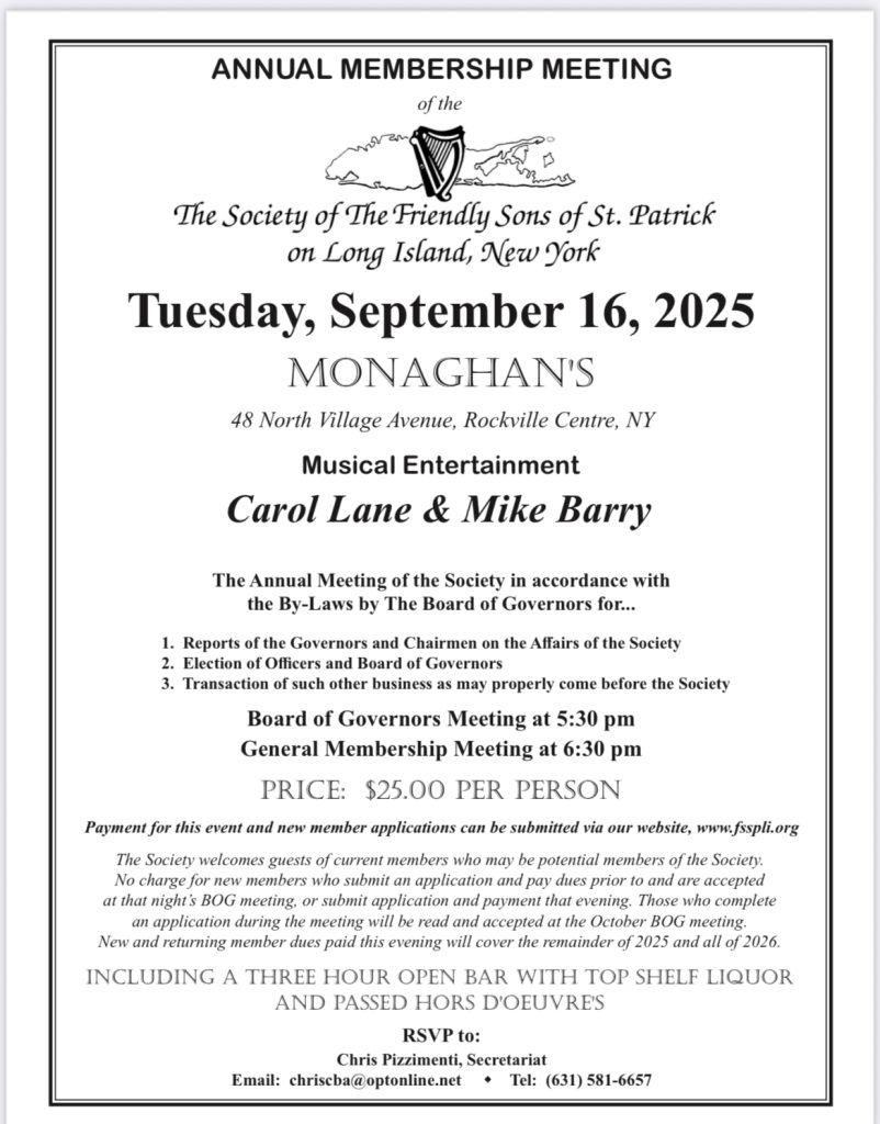 Hope this email finds everyone well and having an enjoyable summer! Please mark your calendar, our Annual Meeting will take place Tuesday, September 16th at Monaghan’s, 48 North Village Avenue, Rockville Centre. The Board of Governors meeting will begin at 5:30PM Sharp followed by the General Membership Meeting at 6:30.