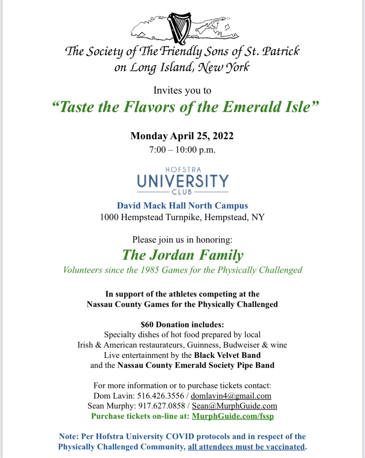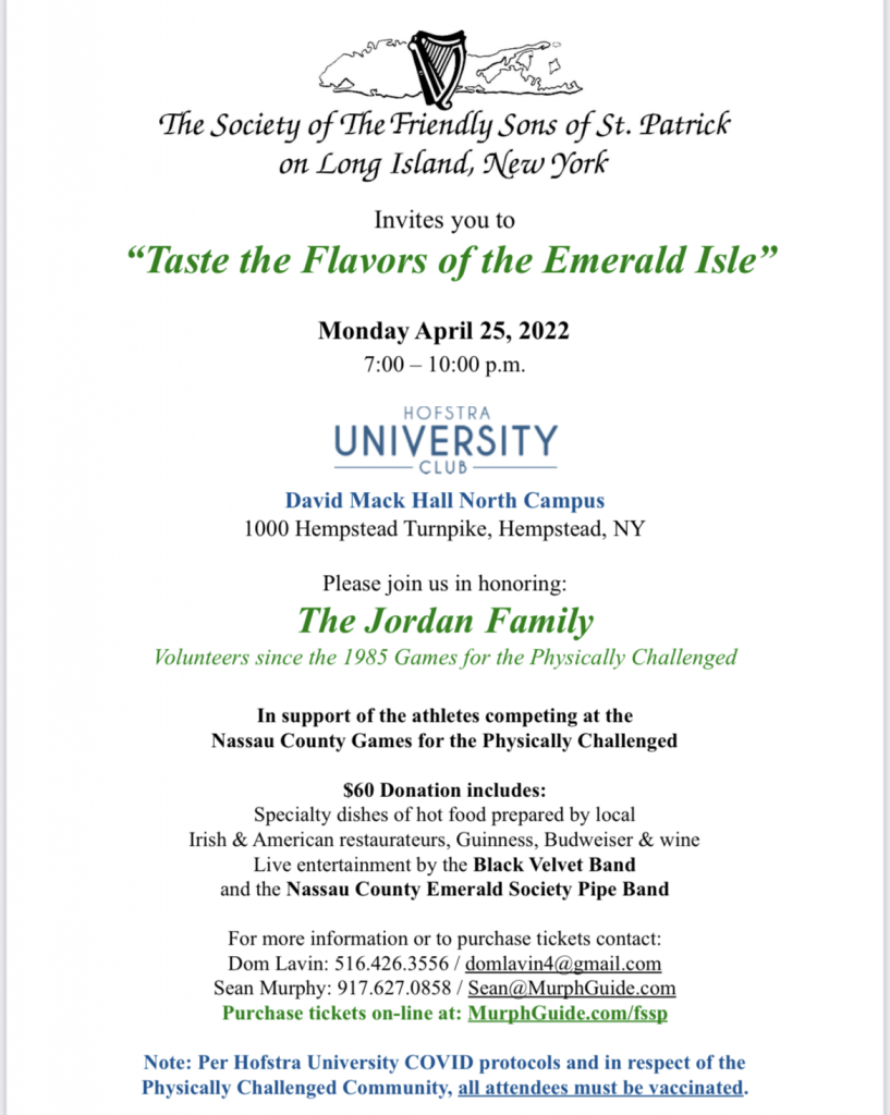 « All Events This event has passed. Taste of Flavors of the Emerald Isle April 25, 2022 @ 7:00 pm - 10:00 pm « 36th Annual Emerald Ball Golf Outing » Add to calendar Google Calendar iCalendar Outlook 365 Outlook Live Details Date: April 25, 2022 Time: 7:00 pm - 10:00 pm Venue Hofstra University 1000 Fulton Avenue Hempstead, NY 11549 United States + Google Map